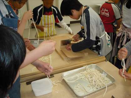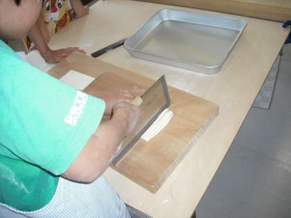 およそ40cmの正方形にしたものを専用の包丁で切っていきます。同じ太さに着れば見た目も美しいうどんになります。