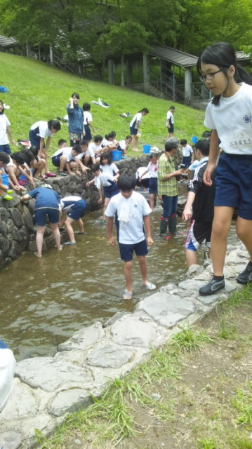 みんなで全部の魚をつかまえました。どうして魚はぬるぬるしているのかな、どうして、といわなの命を頂くことを考えました。昼からさばいて頂きます。大切な命の学習です