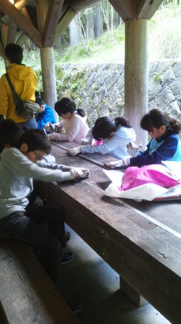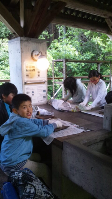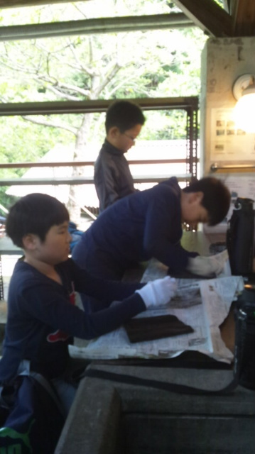 二日目にかまどで焼いた杉板。新聞紙で一生懸命に磨くとキラリと光ってきます。明日、学校でペイントします。思い出の作品です。