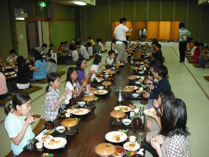 子どもたちが楽しみにしていた夕食の時間です。メニューが豊富でみんな大喜びでした。
