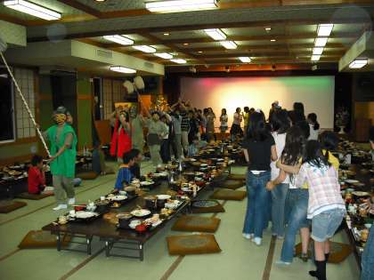 夕食後,大広間でホテルの方が阿波踊りを踊って下さいました。。「錦林小学校みなさんもどうぞ一緒に踊ってください。」と声をかけていただき,多くの子どもたちがホテルの方に続いて楽しそうに踊りました。