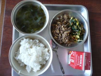 今日の献立は,牛乳,ビビンバの具,ごはん,わかめスープです。