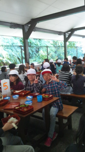 海が見える野外炊事場で食事です。美味しさいっぱいです