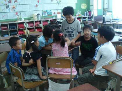 運動会のたてわり種目について話し合いを持ちました。1年から6年までのグループで話し合いをするとき,6年は最高学年のリーダーとして活躍しています。