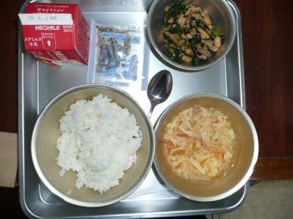 今日の献立は,牛乳,にくみそいため,トマトとたまごのスープ,ごはん,じゃこです。