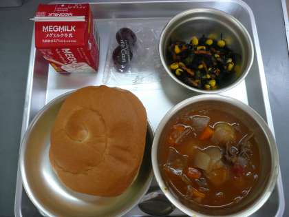 きょうは「バターうずまきパン・牛乳・トマトシチュー・ひじきのソティ・ぶどう」でした。トマトシチューはホールトマトがたっぷり入って少し酸味が強いので苦手な子どもも多いようです。ぶどうは,「巨峰」という種類のぶどうです。秋の味覚を喜んで,皮ごと食べている子どももいました。