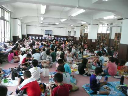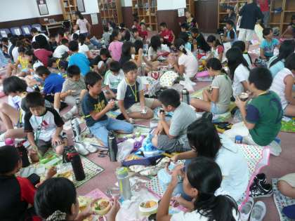 昼食は各ブースごとにまとまって食べました.上賀茂小学校の子どもたちともすっかり仲良くなりました.午後は午前中の反省点を生かして活動しました.ボランティアとして各ブースでお世話になりました保護者のみなさま,本当にありがとうございました.