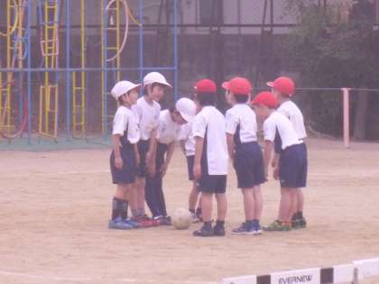 日差しがあたたかくなった今日,運動場では1年生がボールけりゲームをしていました。