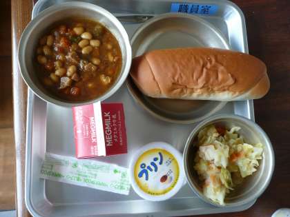 今日の献立は,牛乳,やさいのホットマリネ,あじつけコッペパン,だいずとぶたにくのカレーに,プリンでした。大豆料理のなかまが増えました。豚肉のうまみ,大豆,野菜のあまみを味わいました。カレー粉のピリッとしたからさは食欲が出ます。ピーマンも入っていました。子どもたちは気づいたでしょうか。