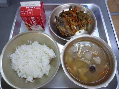 きょうの献立は「ごはん・牛乳・さばのたつたあげ・野菜のきんぴら・いものこ汁」でした。たつたあげは,魚の献立の中でも子どもたちが好きな献立です。かりっとした衣が人気です。野菜のきんぴらは,にんじん・つきこんにゃく・三度豆を炒めました。いものこ汁は,秋の味覚である里芋やしめじを入れた具だくさんのみそ汁です。