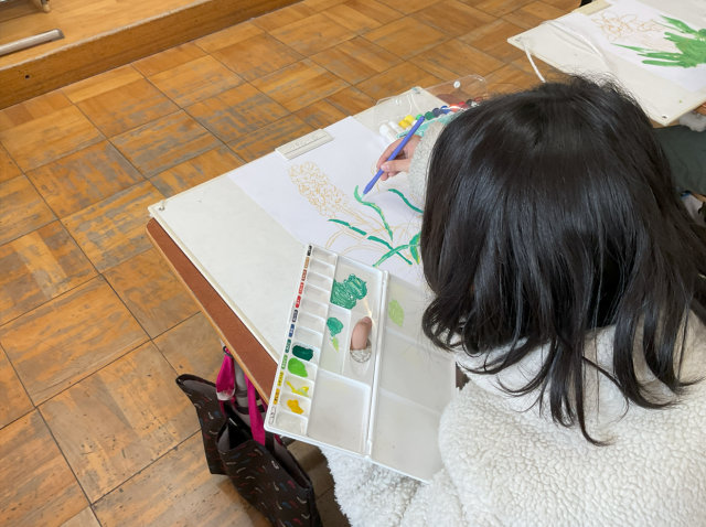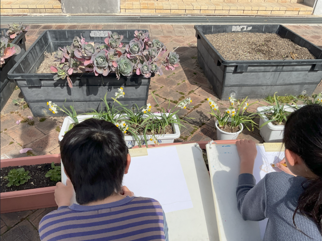子どもたちは花の色や葉の形などの細かい部分まで、じっくり観察しながらスケッチをしていました。そして、丁寧に色を塗って仕上げることができました。