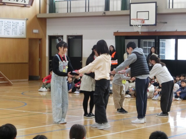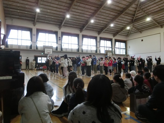 体育館で児童会活動「6年生を送る会」を行い、1~5年生が今までお世話になった6年生に感謝の気持ちを込めて歌や言葉の贈り物をしました。