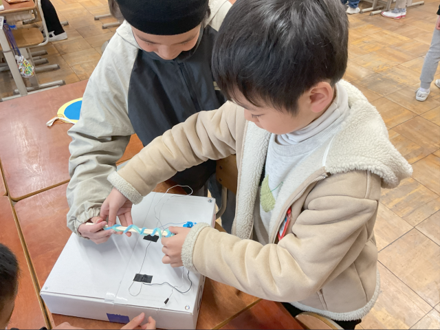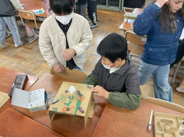 3年生の理科の学習で、これまでの学習を生かしておもちゃを作って遊びました。子どもたちは磁石の性質を生かして魚釣りゲームを作ったり、電気の性質を生かして輪くぐりを作ったりするなど、工夫しながらおもちゃを作っていました。そして、たくさんのおもちゃで遊びながら学びをふり返っていました。