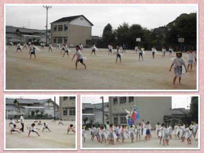 一週間ぶりでしょうか。4年生が運動場で練習しているところを見かけました。先日は何も身につけず,手に持たず,といった状態でしたが,今日はビニル袋で作ったお手製のはっぴと,大漁旗,はちまきを身につけたり持ったりしていました。実際にはお揃いのはっぴを着るようですが,練習はビニル袋のはっぴだそうです。