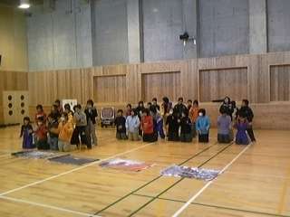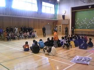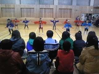 花背小中学校のオープンスペースと体育館でお互いに出し物をしました。