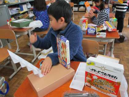 その後,身の回りにある空き箱やトイレットペーパーの芯などの材料を使って,友達の家を作りました。「2階建てにしよう。」「ブランコを作って遊べる場所を作ってあげたいな。」と色々と考えながら楽しく作ることができました。