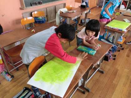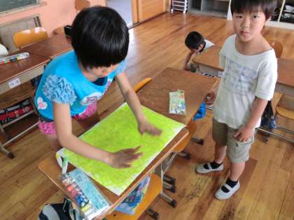 今日は,背景を描きました。自分の手に絵の具を付けて,パタパタと画用紙を叩きました。それぞれが個性豊かな色の背景にすることができました。