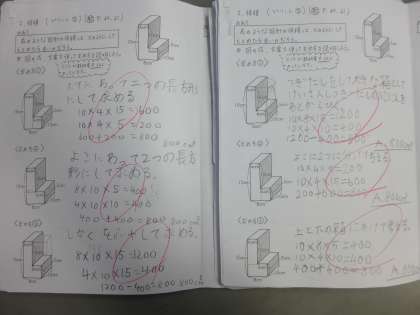 みなさんは,どんな方法で考えましたか。教科書20ページにのっている3通りの方法で考えている人がたくさんいました。計算ドリル9のような問題は解けますか。課題が終わった人は,1回考えてみてください。