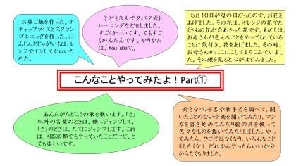 先週の家庭訪問で,「休校期間中の過ごし方を紹介できる人は,教えてね。」とお願いしていましたね。すると,たくさんの人が,休校期間中の過ごし方を書いて教えてくれました。少し紹介しますので,「良いな。」と思ったことにぜひチャレンジしてみてください。書いてくれていた人で,「出すの忘れた!」という人は,また来週提出してくださいね!