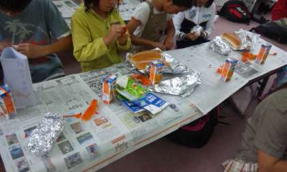 朝6時半に起床。掃除をして、朝食の準備をしています。メニューはパックドッグ。パンにキャベツを炒めたものを挟んで、ウィンナーをさらに挟んでアルミに包み、牛乳パックに入れ、それに火を付けて焼きます。