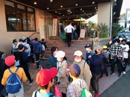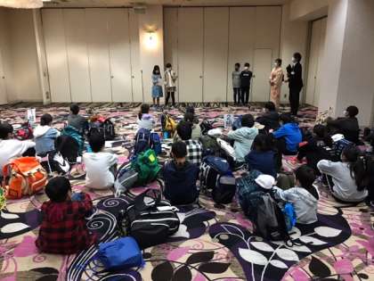 宿泊施設に到着し,入館式をしているところです。