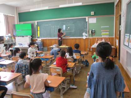 7のかずについての合成と分解です。たとえば1と?,答えは6といったような学習をしてから友達と問題の出し合いをします。つくえを近づけて「2と?」,「う〜んと,5」「正解!」といったやり取りをしながら理解を深めていきます。お時間があれば,おうちでもお子様とやっていただけると楽しみながら学習が深まると思います。