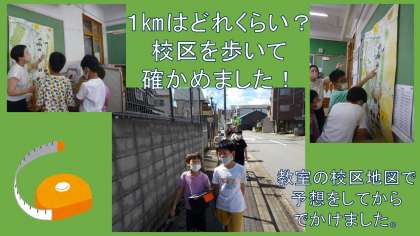 教室にある校区地図で,「学校から1キロメートル歩くとどこまでいけるだろう。」と予想を立てて,