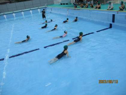 低水位での水慣れで、友だちと水をかけあったり、わにになって水の中を動いたりしました。友達と関わり合いながら活動し、身体もしっかり動かすことができました。
