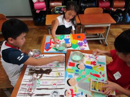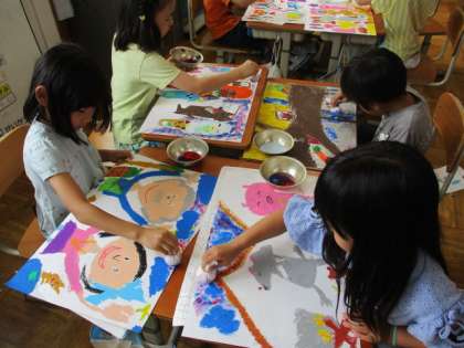 お話を読み聞かせしてもらい、イメージした絵を描いています。
