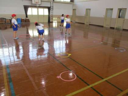 輪っかを使って、5歩しまとびをしました。輪っかの位置をグループで考えながらリズムよく跳んでいました。