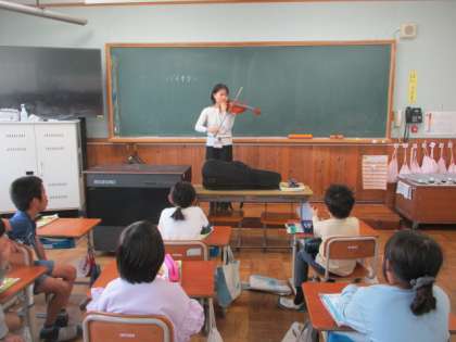 音楽の時間にバイオリンの演奏をしていただきました。校歌などの演奏を聴き、口ずさみながら聞き入っていました。