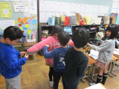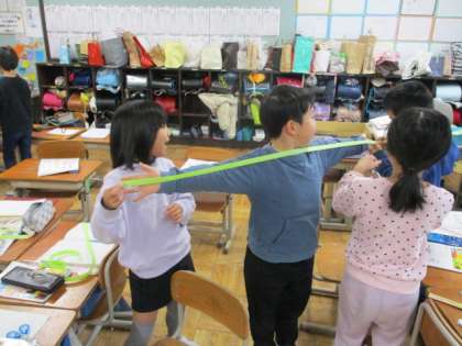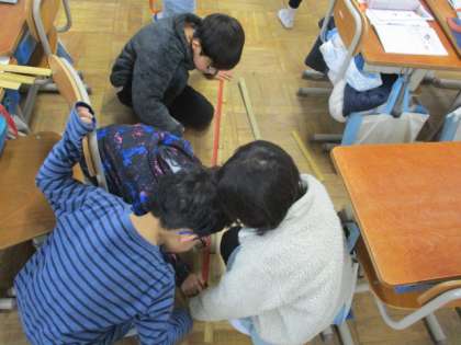 両手を広げた長さを調べました。グループで協力しながら、計測していました。