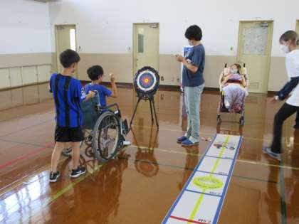 ふれあい親子学習会では、ゲストティーチャーの方に来ていただいて、車いすでハンドアーチェリーの体験をさせてもらいました。