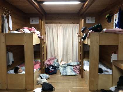 こちらは2段ベッドの部屋。ベッドに入り、1人ずつ今日一番の思い出を発表しています。明日は朝が早いです。ゆっくり寝て、明日に向けて元気を蓄えてほしいです。