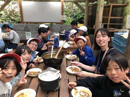 カレーが出来上がりました。どの班も満足のいく出来上がりで、何度もおかわりしていました。こちらも班は、何と山の家期間中に誕生日を迎えた子がいます。みんなでハッピーバースデーを歌って祝いました。お誕生日おめでとう!!
