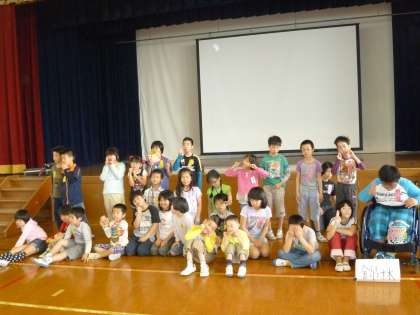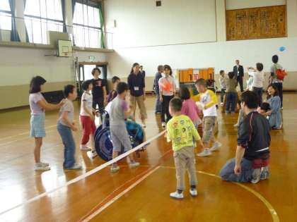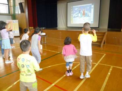 今回は,養徳・養正・北白川・錦林・第三錦林の5校が集まって,楽しく「マルマルモリモリ」のダンスを踊ったり,学級対抗風船バレーで他の学校のお友達と対決したり,しっぽ取りゲームで,獲ったしっぽの数を競ったりと,みんな汗をかきながらも,たくさん走って,たくさん飛び跳ねて,大きく体を動かして楽しんでいました。