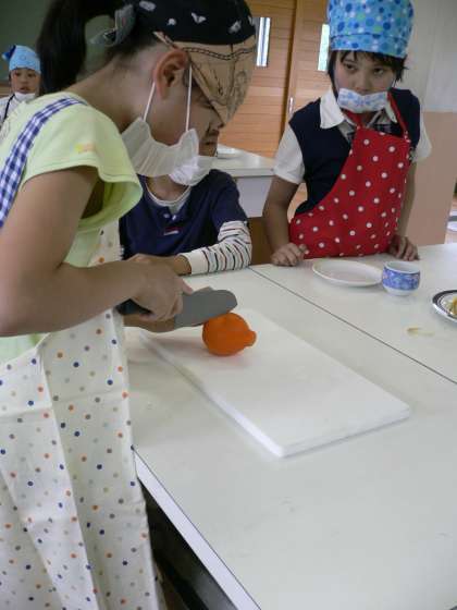 「材料を押さえる手はネコの手!」「包丁は引くときに力を入れるよ!」「包丁を運ぶ時は『包丁,通ります!』と声をかけて。」と大事なことを確かめながら調理できました。
