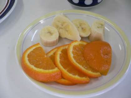 包丁の使い方や運び方を確かめた後,オレンジとバナナを切って盛りつけました。