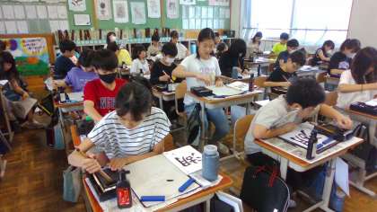 6年生は、今、3つの部分の組み立てに気をつけて「湖」の練習をしています。自分にめあてに沿って、はらいや3つの文字のバランスに気を付けて書いていました。書き始めると集中して黙々と書道に取り組むことのできる6年生です。