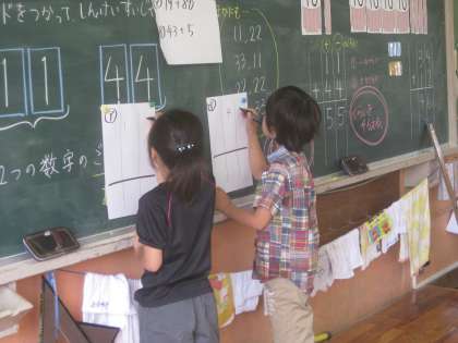 今日は,「くり上がりのない 2けた+2けた」でした。写真は,みんなの前で筆算を解き,計算の順序を説明した場面です。