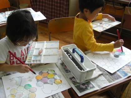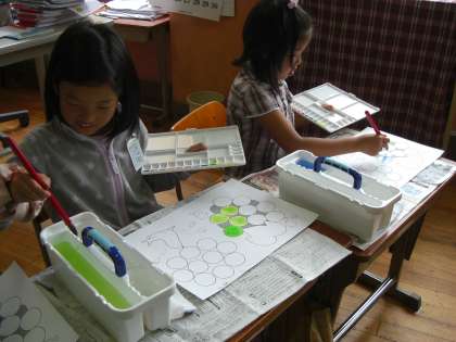 図画工作科の時間,初めて絵の具を使って学習しました。絵の具を使って学習することが大好きな子どもたちは,休み時間から,用意をしてまっています。