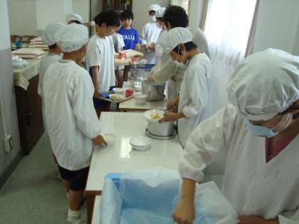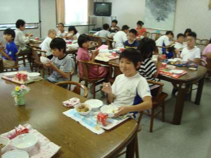 普段はアルミの食器ですが,ランチルームでの給食のときは陶器の食器を使えます。子どもたちは食べやすいと喜んでいました。