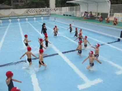 水遊びの約束を確かめた後,プールに入ってみました。