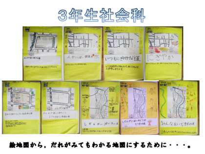 3年生の社会科の学習では,「校区探検」→「調べた場所ごとに絵地図に表す」→「地図記号を用いたり,色を統一したりしてみんなで校区地図をよりよいものにする」という活動を行っています。
