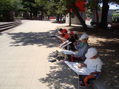 図画工作の学習で京都市美術館に写生をしに行きました。とても天気がよく,日なたにいれば汗ばむ陽気でした。細かな部分までよく見て丁寧に描いていました。これから水彩絵の具やコンテで色をつけていきます。