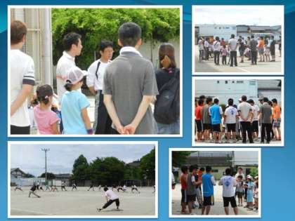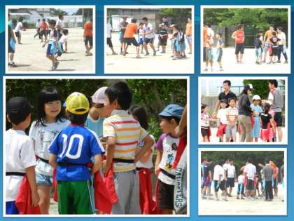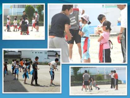 おやじの会会長のあいさつから始まって,京都大学アメリカンフットボール部の皆さんからの自己紹介。そして,準備運動,身体慣らし・・・と,時間は進んでいきました。 はじめは,集合するときに,大学生のお兄さん達が余りに大きな声を出されたことにビックリして,泣き出しそうになっていた低学年の子ども達も,ゲームの仕方を教えてもらう中で大学生のお兄さん達とも仲良くなり,笑顔でフラッグフットボールを楽しんでいました。