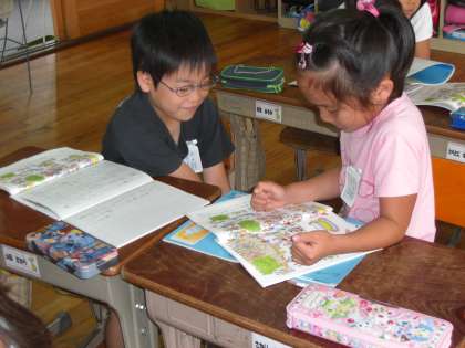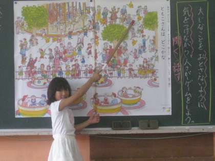 教科書にある「ともこさんは どこかな」では,迷子のアナウンスを聞き,絵の中からその特徴に合った人物を探します。