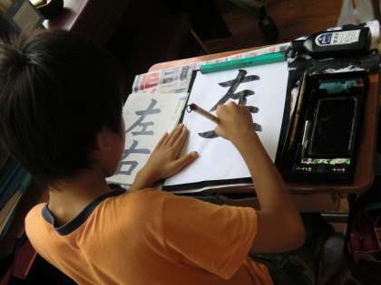 「左 右」という字の書き順や横画,はらいの長さに気を付けながら,子どもたちは真剣に練習していました。