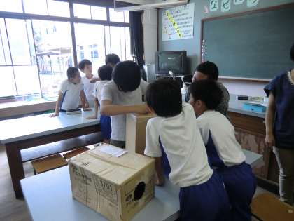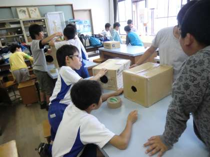 各グループ,穴の大きさを小さくしたり,形を工夫したり,手でたたく面の面積を広くとったり…と試行錯誤しながらパワーアップした空気砲を作っていました。