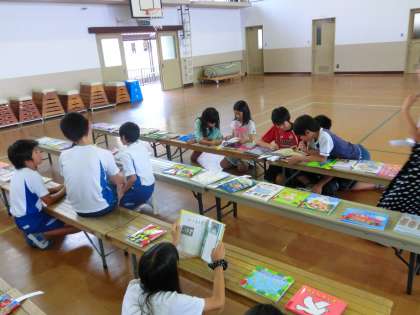 たくさん並んでいる本から自分が学校にあったらいいなと思う本を2冊選んでいました。